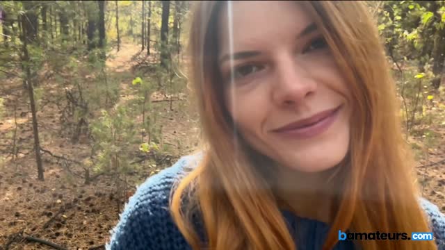 Ginger babe swallows cock in the woods