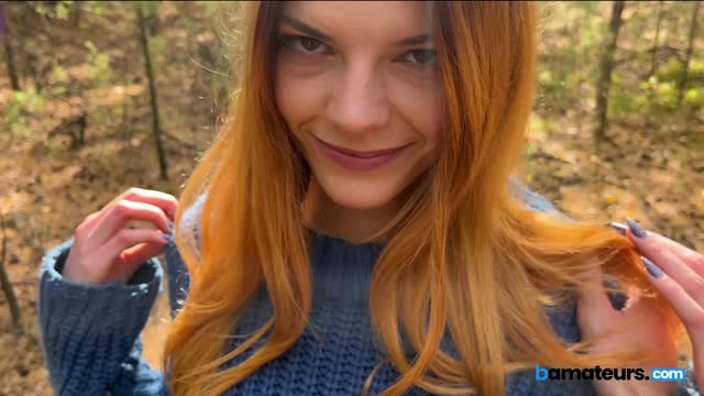Ginger babe swallows cock in the woods